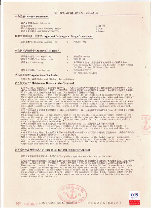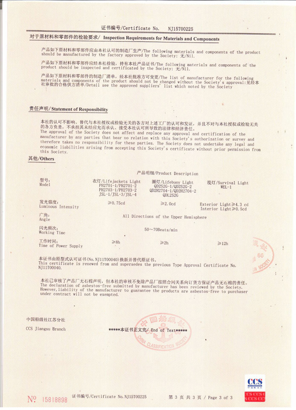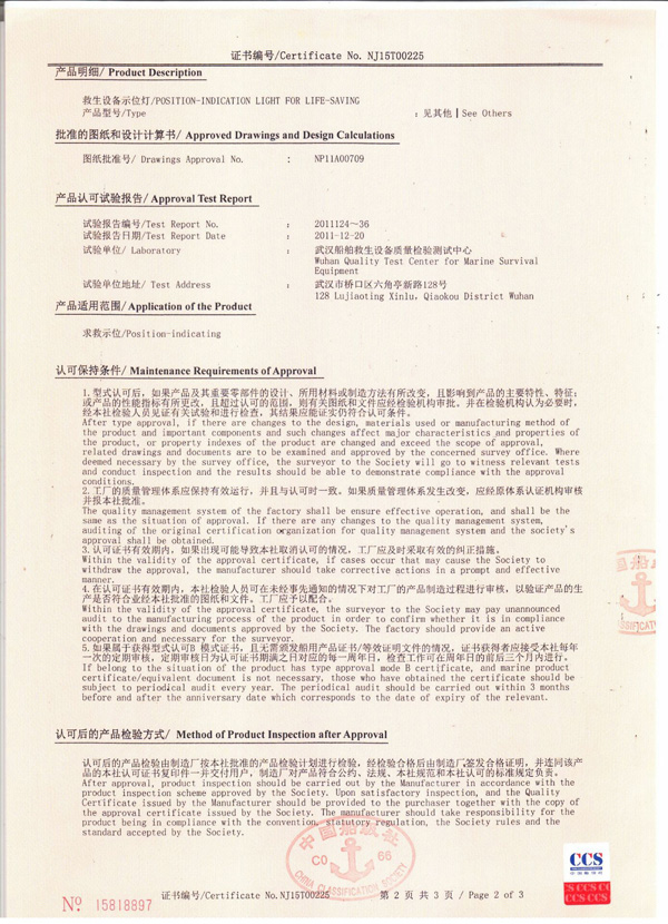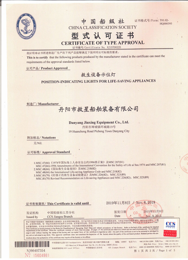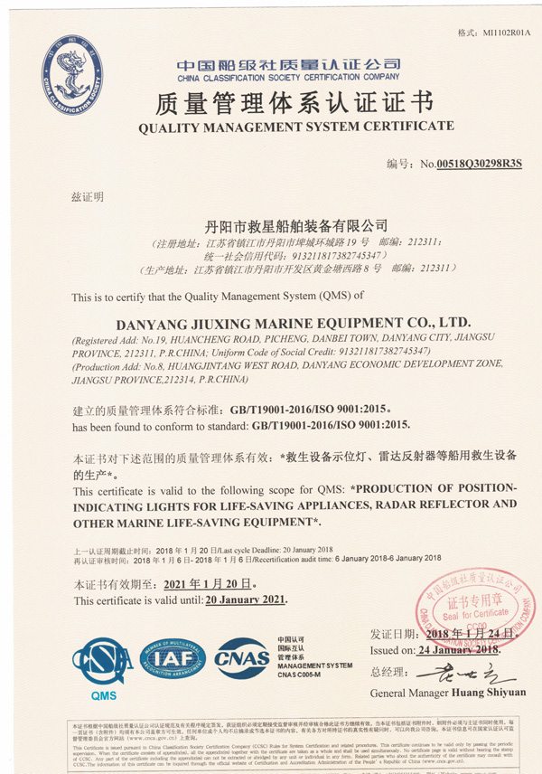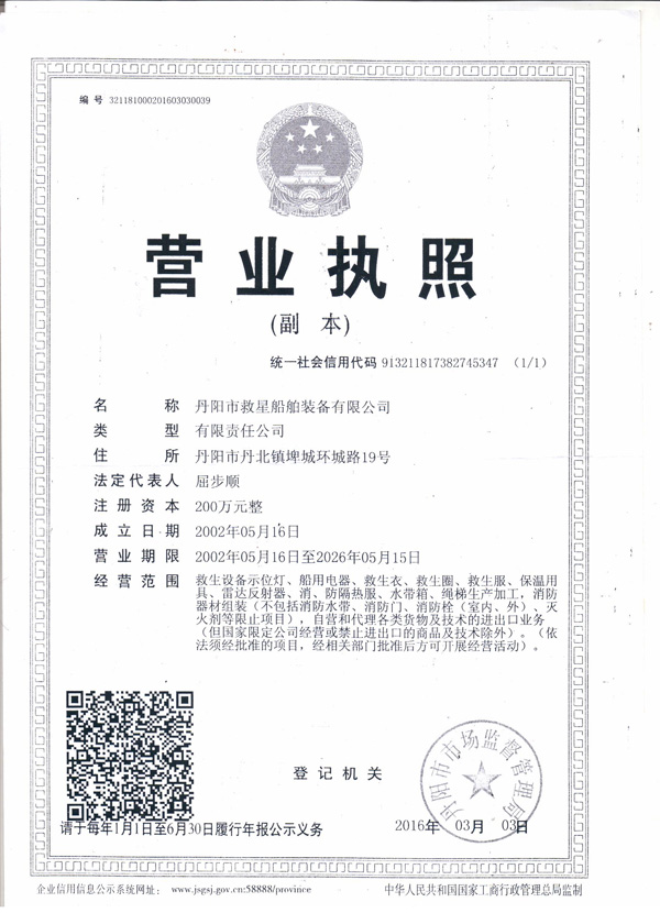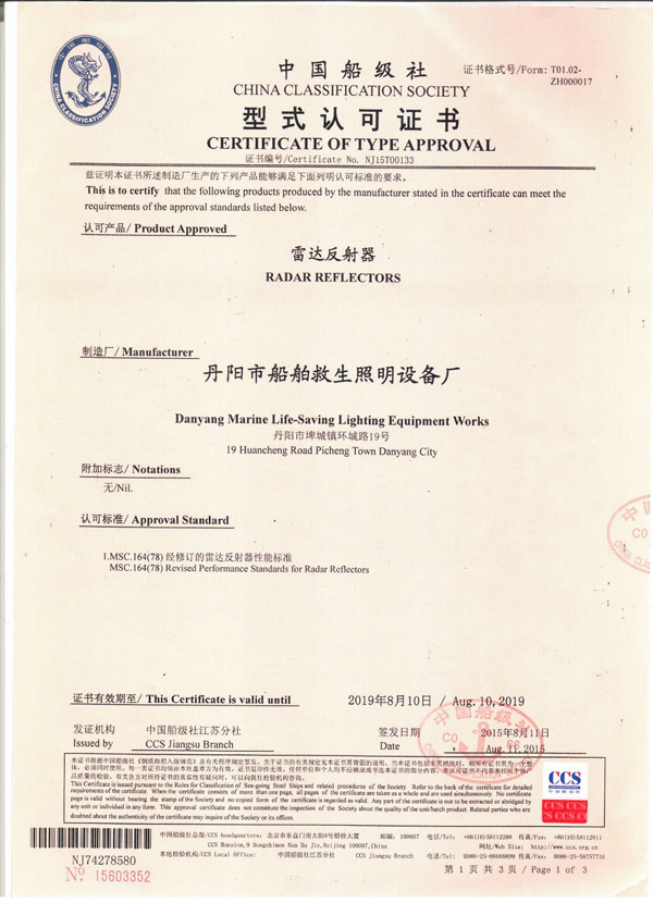 丹阳市救星船舶装备有限公司为丹阳市船舶救生照明设备厂子公司,主要生产救生设备示位灯、雷达反射器、引航员软梯、登乘梯等产品。其中救生设备示位灯采用国际上最先进的科学技术、生产工艺,优质材料制造,各项技术指标超过国际先进水平,完全满足国际最新标准。2012年元月取得“CCS”型式认可证书,并具有欧共体“EC”证书。另外本公司制造的RDF400雷达反射器还获得了实用新型专利。